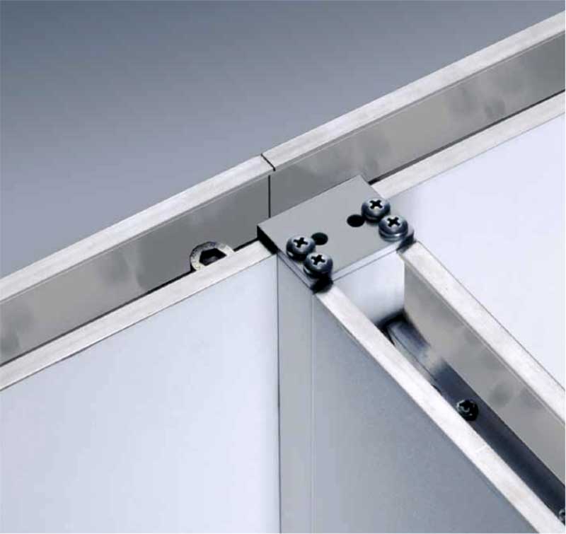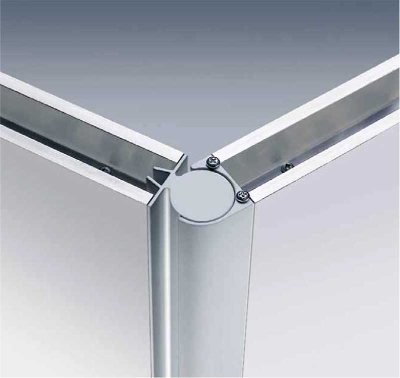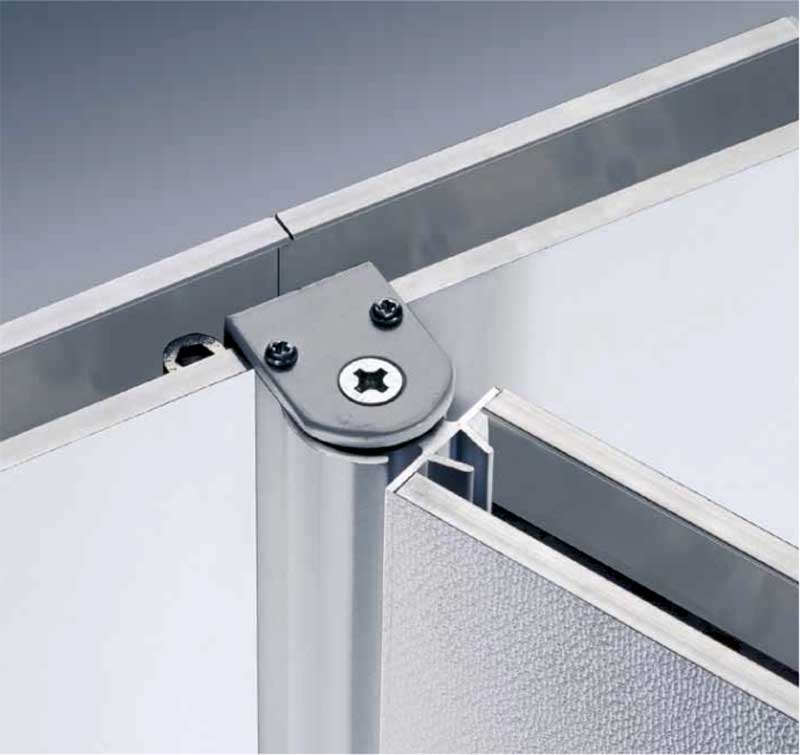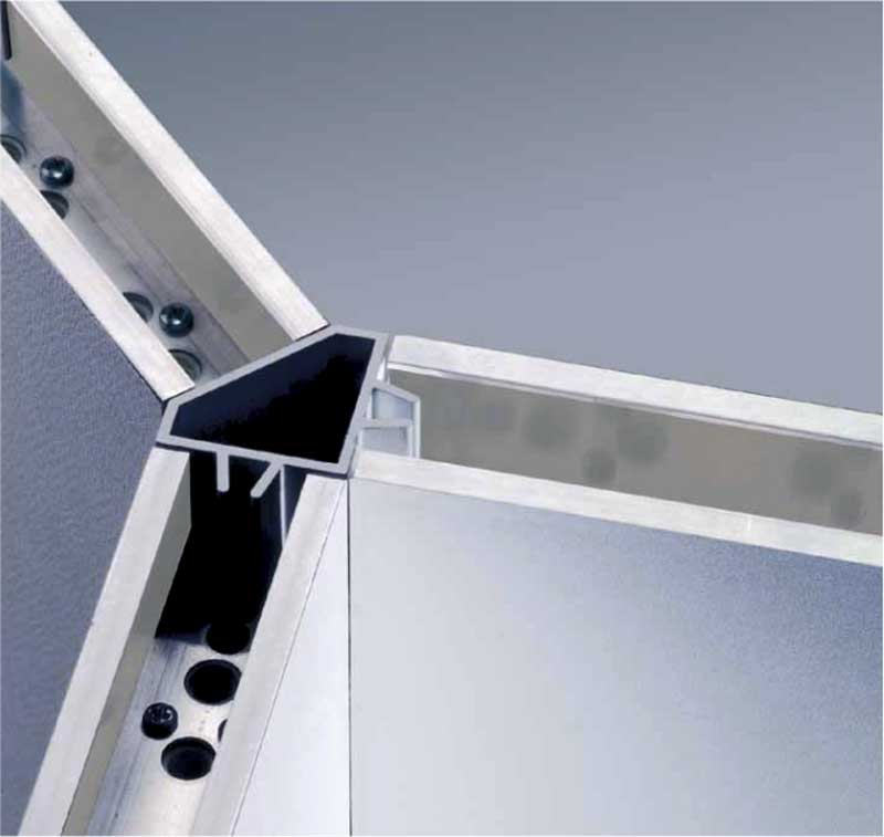 Gracias a la gran variedad de perfiles, el sistema nos ofrece la posibilidad de conexionar los módulos en múltiples ángulos. Podemos configurar los paneles en muy distintas disposiciones. Desde los ángulos fijos a 60 °, 90 ° o 135 °, pasando por ángulos variables, todas las configuraciones son posibles. El sistema le permite desde cualquier punto de la pared iniciar con cualquier ángulo otra pared. Las paredes pueden ser construidas en forma curva segmentada gracias a los conectores de ángulo variable